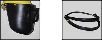 Welding face shield Key Features : Designed to worn with safety helmet. Flip type front window. With clear and DIN glass filter lens (11 to 14 DIN shade). Spring type fittings. As per EN : 175. Viewing Area : 70mm x 95mm. Glass Storage Area : 85mm x 108mm